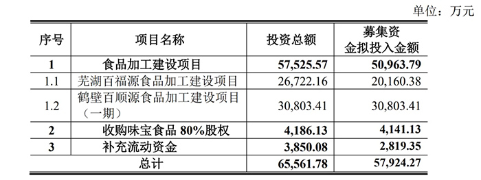 2024年1月16日,千味央廚披露2023年度向特定對(duì)象發(fā)行股票上市公告書,募集資金總額5.9億元,扣除發(fā)行費(fèi)用后募集資金凈額5.79億元。從募集資金用途來看,食品加工建設(shè)項(xiàng)目擬投入占比較大,其次是收購味寶食品80%股權(quán)和補(bǔ)充流動(dòng)資金。